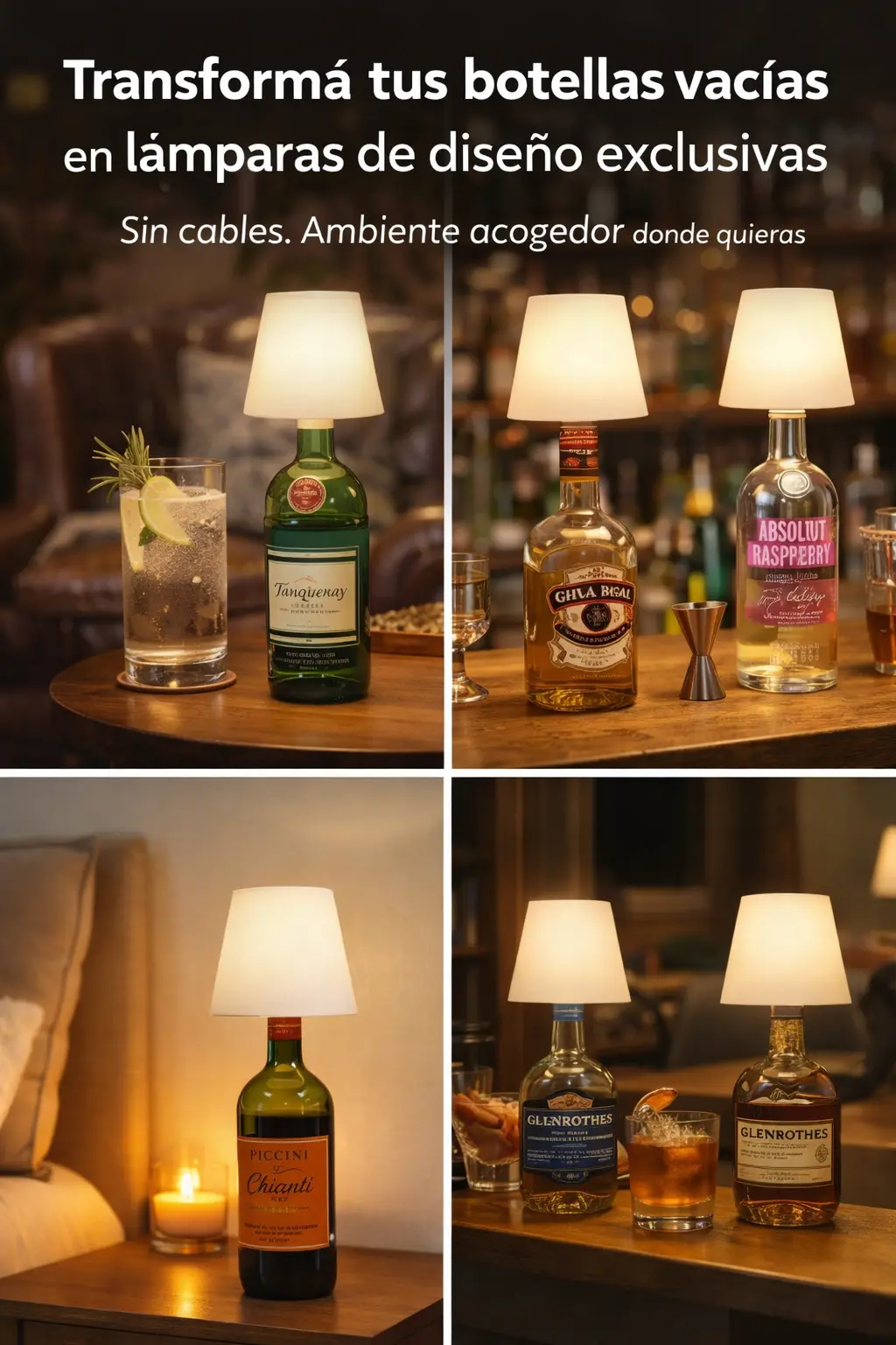 Sin cables. Sin enchufes cerca. Solo estilo, calidez y un ambiente acogedor donde quieras. Dale una segunda vida a tus botellas favoritas y creá una iluminación sofisticada que se robe todas las miradas.