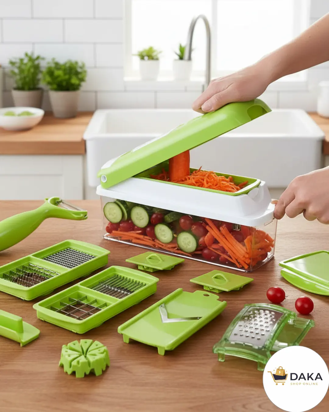 Mandolina multifunción 12 en 1, ideal para cortar, rallar y picar todo tipo de vegetales y frutas en segundos. Incluye 5 cuchillas intercambiables de acero inoxidable para hasta 22 tipos de cortes diferentes: cubos, bastones, rodajas, rallado fino, grueso y más. Viene con recipiente contenedor, pelador y accesorios de seguridad para una preparación fácil y rápida. Perfecta para ahorrar tiempo en la cocina y obtener cortes uniformes.